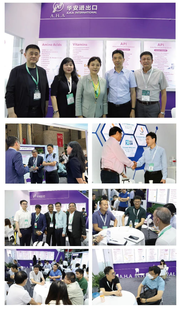 This exhibition was led by Liang Qing, Chairman of A.H.A International Co., Ltd, and a team led by Gao Yu, Chairman of Huayi Pharmaceutical, Yu Lingmin, Vice President of A.H.A International, Jiang Yelong, Vice President and General Manager of Food Ingredients Division, Wang Yunfeng, Vice President, Wang Qizhuang, Assistant President and General Manager of Pharmaceutical Division, and Li Yuanyuan, General Manager of Nutrition and Health Division, participated in discussions on products and services that interested customers.